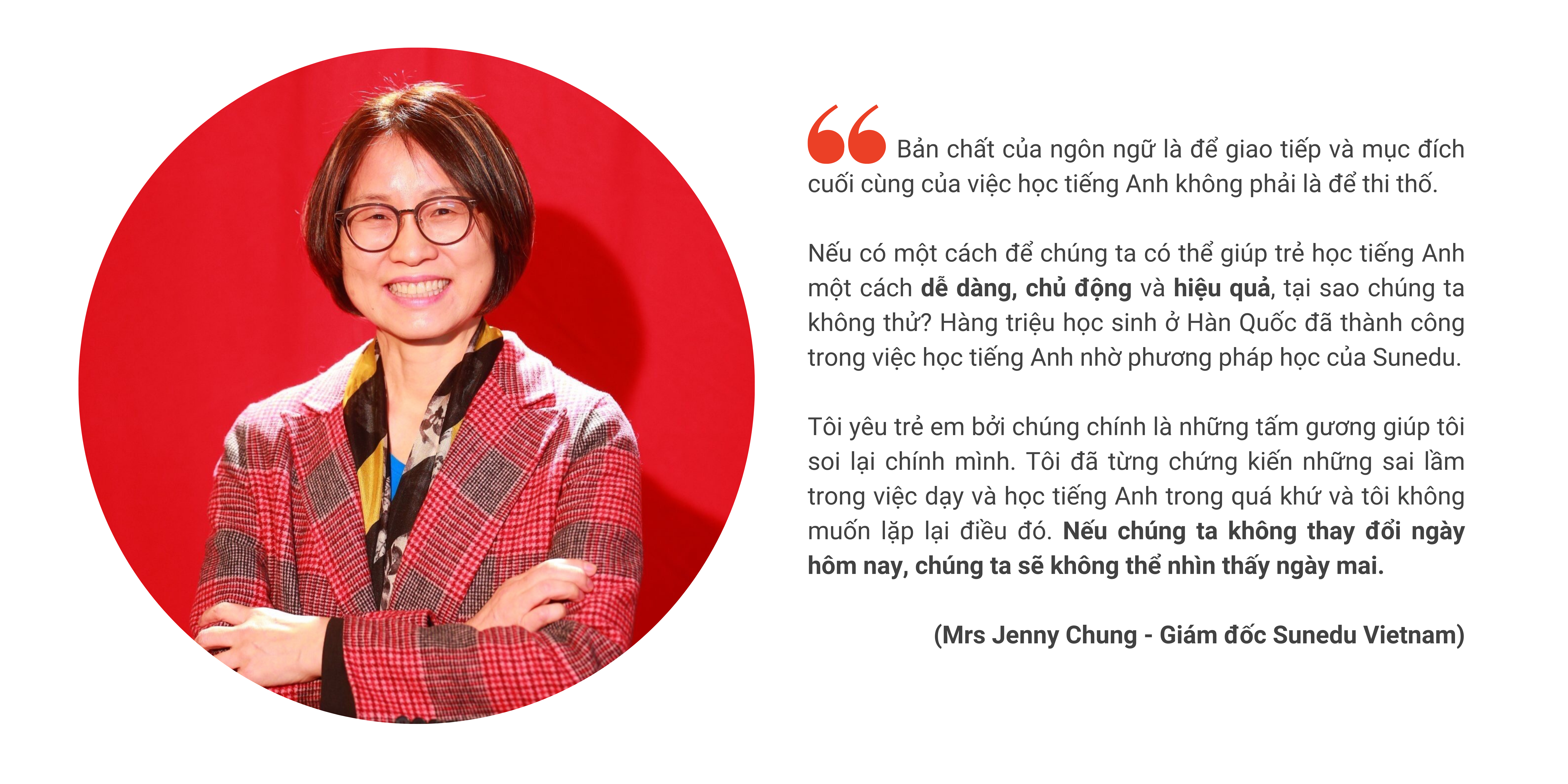Có thể nói việc sở hữu năng lực tiếng Anh tốt là một điều kiện tiên quyết để bước ra thế giới làm việc, học tập và trở thành công dân toàn cầu. Thế nhưng việc dạy và học tiếng Anh, đặc biệt là ở một quốc gia sử dụng tiếng Anh như một ngoại ngữ không phải là điều dễ dàng. Trong bài viết này, hãy cùng Sunedu “theo chân” cô Jenny Chung – Giám đốc Sunedu để tìm hiểu và khám phá ra một phương pháp học tiếng Anh thật dễ dàng và hiệu quả nhé!